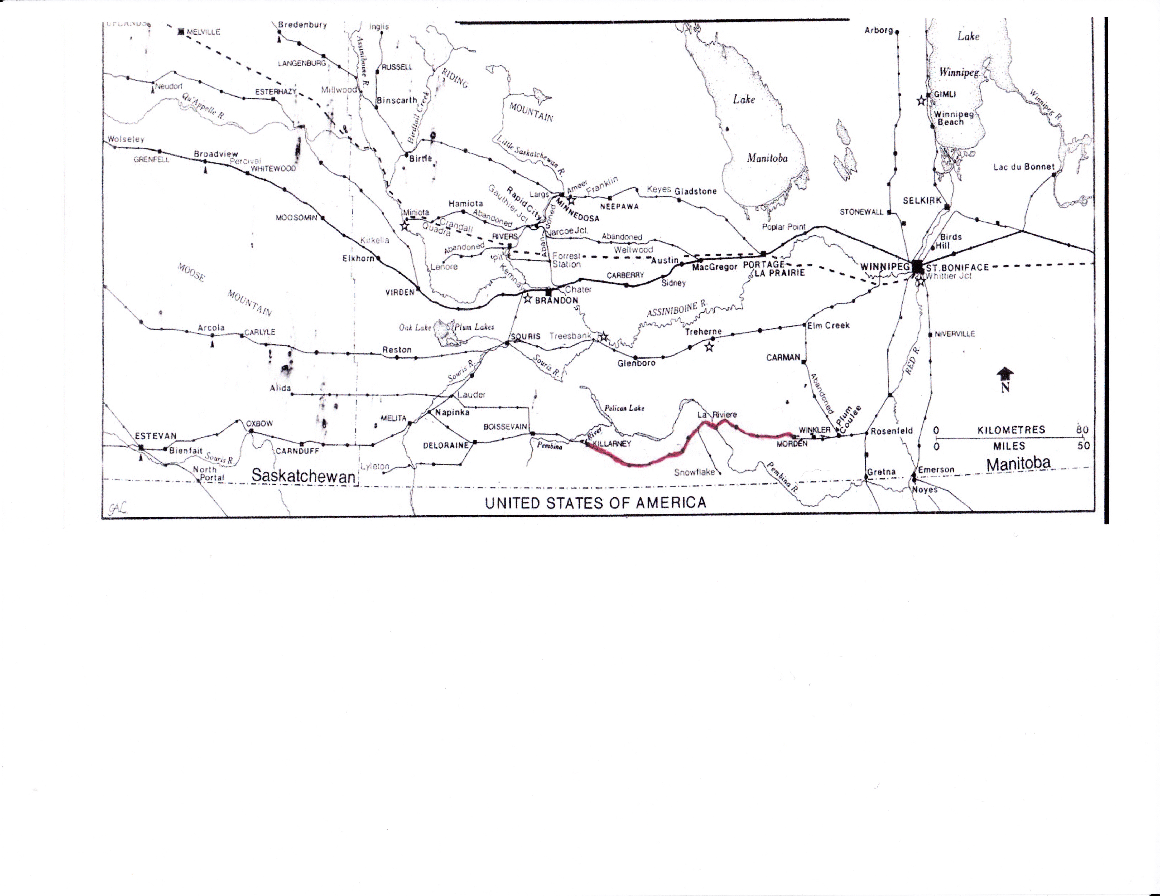III) The B.R.M.N.A. Map, and the sections of La Riviere/Napinka Subdivisions abandoned in 2006. (Red line – bottom centre) Map source: “Canadian Pacific in Manitoba” , B.R.M.N.A., Stuckey, L.A., 1984. (For larger image, double click on map)