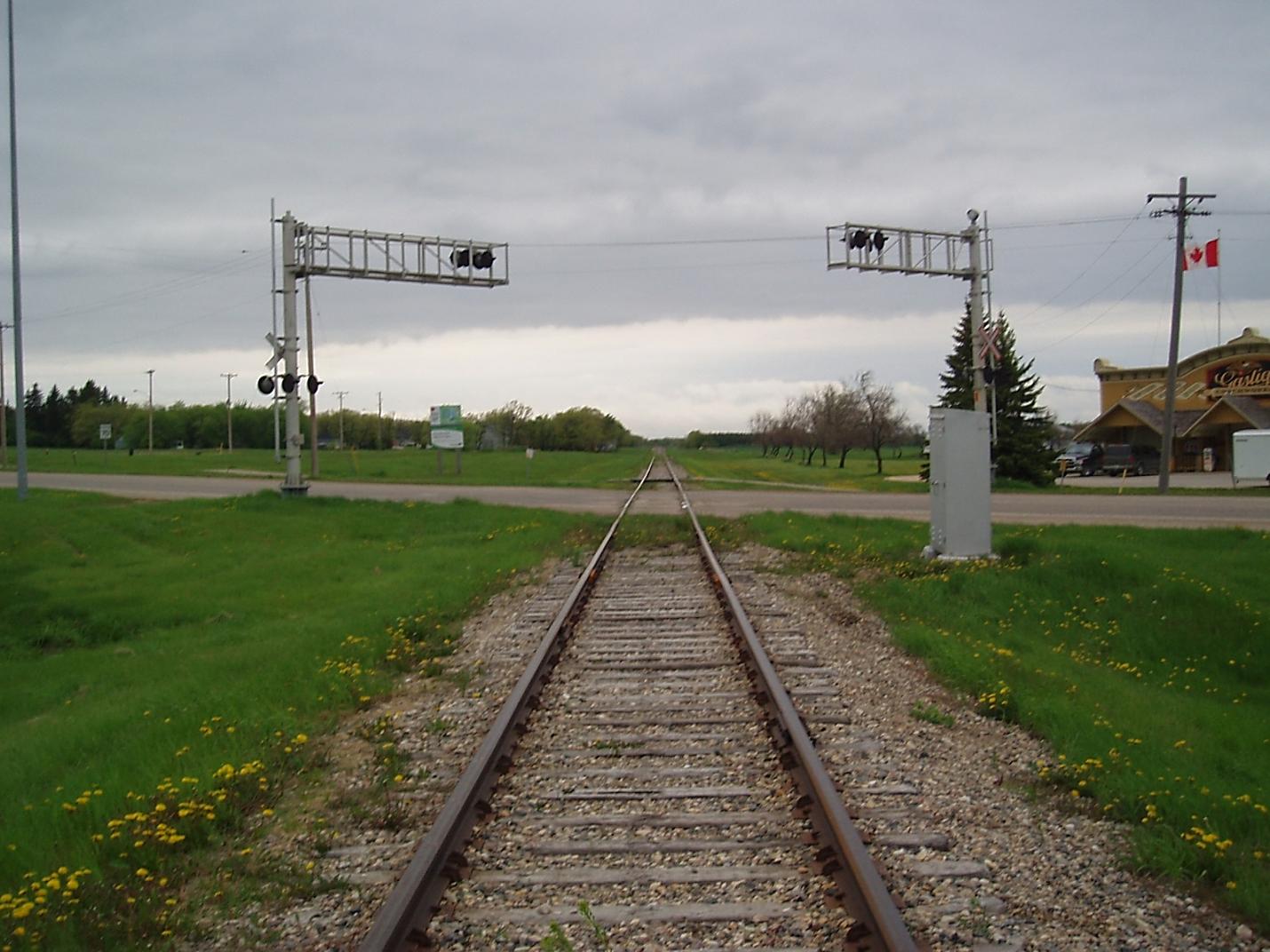 2011/05. Mile 80.5 Boundary Trail Railway Co. (formerly CPR). Looking N.E. along track crossing Hwy. No. 3. Former site of “Pembina Mountain Clays” across Highway No. 3, and to the left. Photo – N. F. © Text and Photos exclusive copyright of N. Froese, Author.