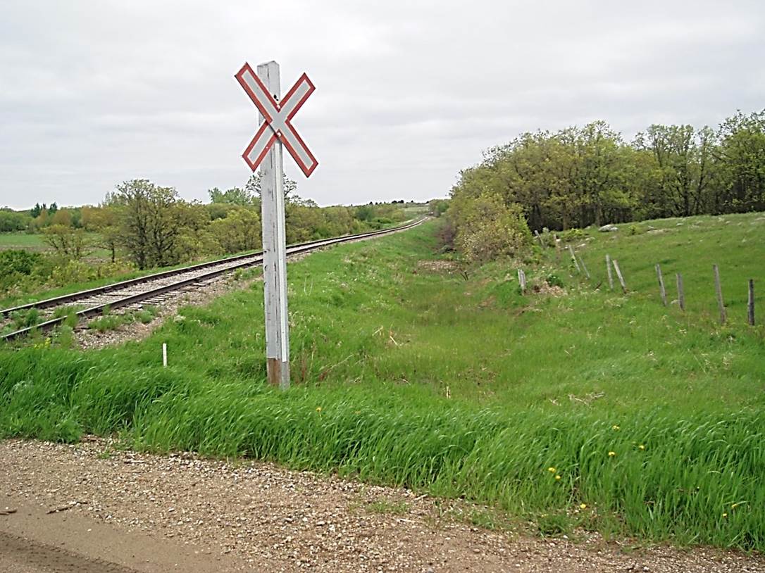 2011/05. Mile 81 BTRC (formerly CPR/ La Riviere sub.) At crossing N.E. of Morden looking back S.E. down the former Lake Agassiz escarpment. ( Click on image for clarity) © Text and Photos exclusive copyright of N. Froese, Author.