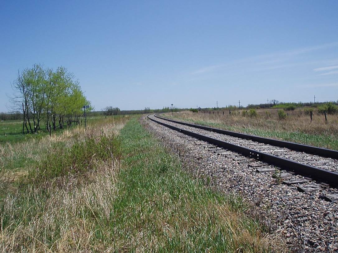 2012/05, BTRC/former CPR mile 82. View – looking back S.E. with track in the foreground turning towards the W. and the rail climbing up over the ancient Lake Agassiz escarpment – N.E. of Morden, MB. (Click on photo for enlargement) Photo – N.F. © Text and Photos exclusive copyright of N. Froese, Author.