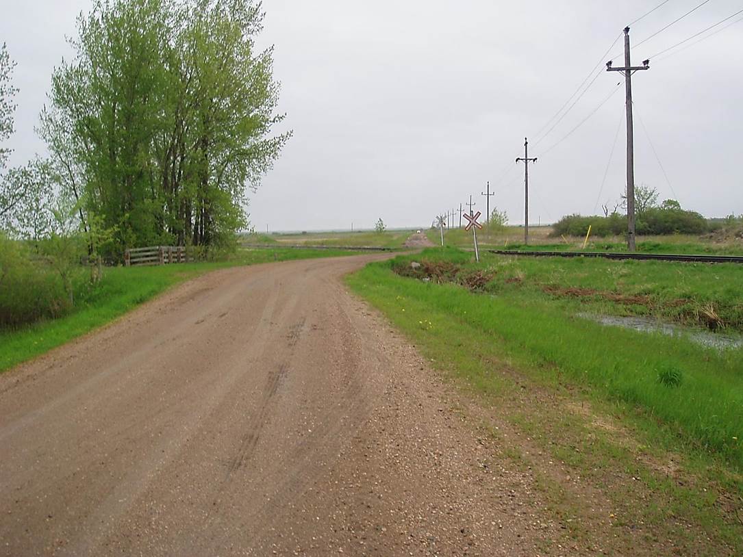 2011/05. Mile 82 BTRC (formerly CPR) crossing, looking S. towards Hwy. No. 3. Elevation from Morden to mile 82, approx. 100 ft. Information: BTRC files. (Click on photo for enlargement) Photo – N.F. © Text and Photos exclusive copyright of N. Froese, Author.