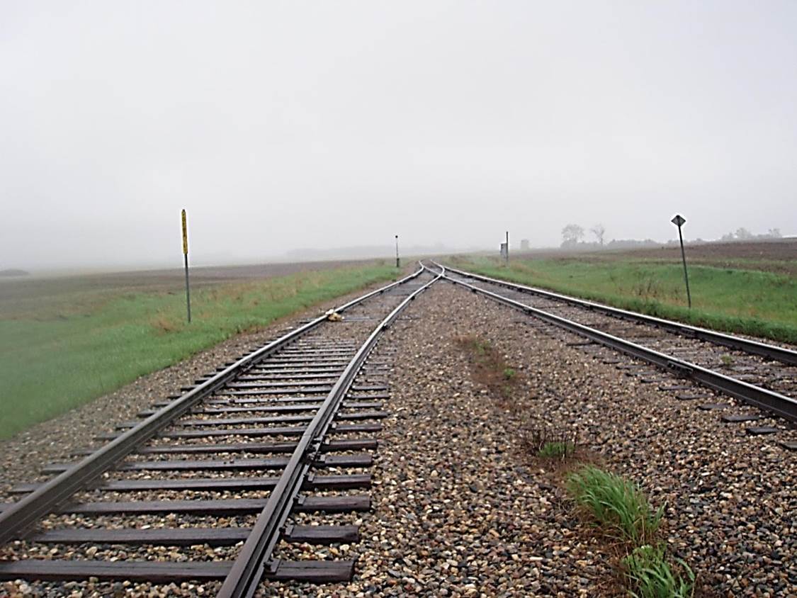 2011/05, BTRC Mile 92, W. end of Darlingford yard looking W. Derail with sign, turnout stand, crossing signal box and whistle sign. Photo – N.F (Click on photo for enlargement) © Text and Photos exclusive copyright of N. Froese, Author.