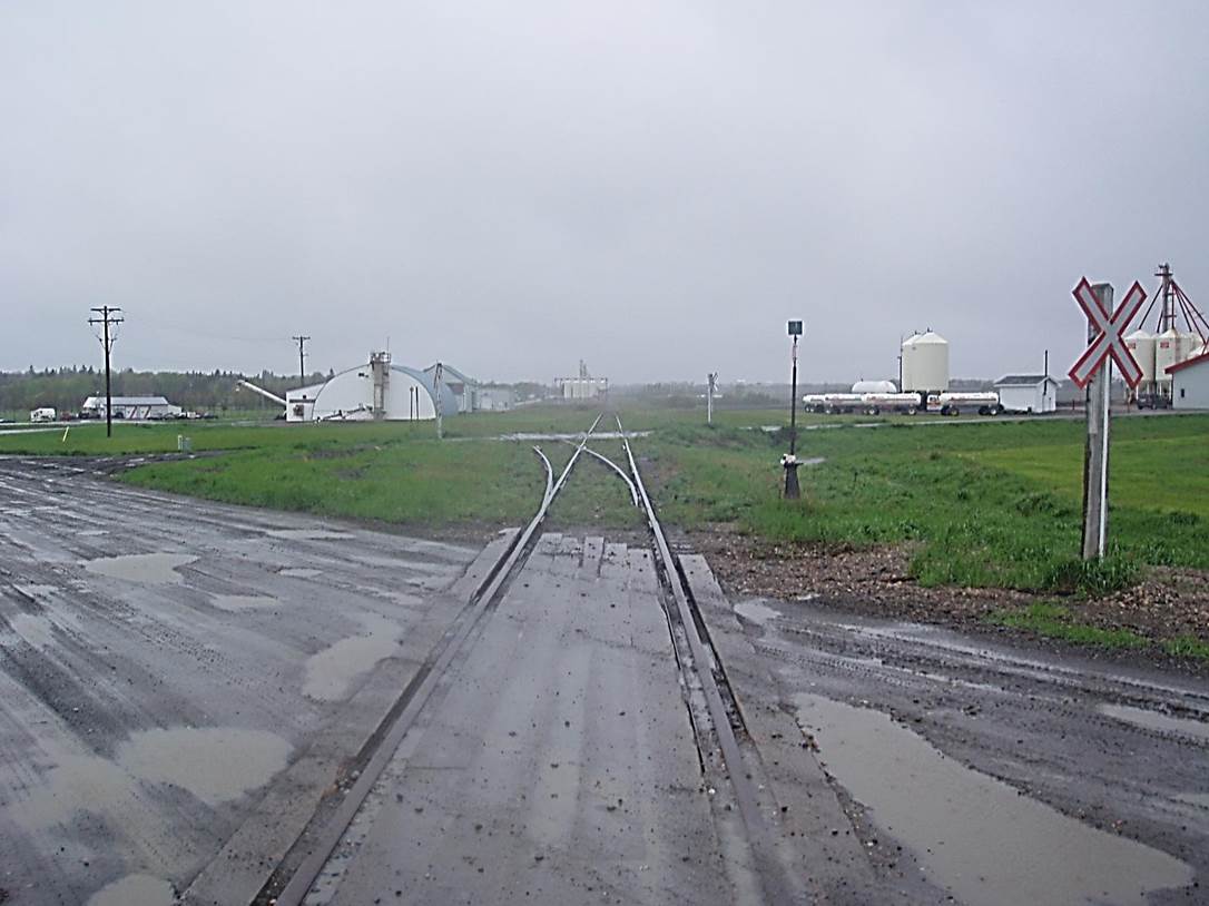 2011/05, BTRC mile 99 into Manitou with left turnout to former U.G.G. grain elevator site. Co-op fertilizer depot on the right. BTRC/Saunders loading facility in the distance. Photo – N.F. (Click on photo for enlargement) © Text and Photos exclusive copyright of N. Froese, Author.