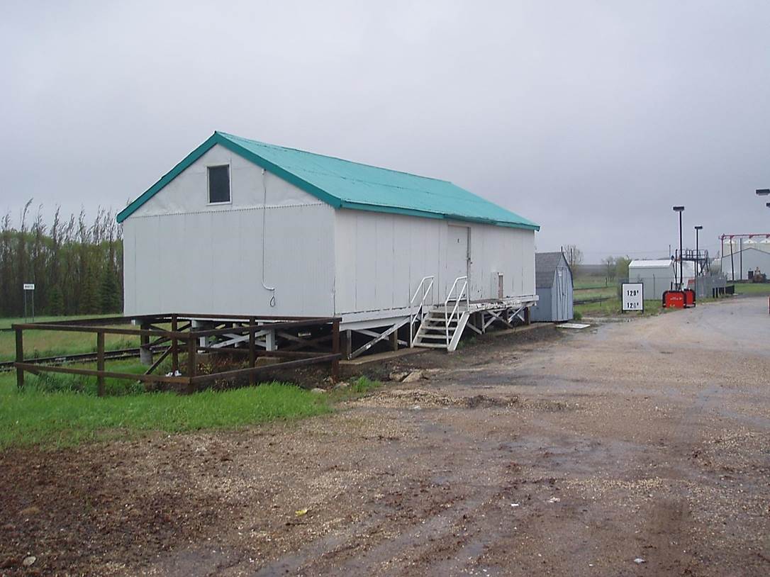 2011/05, Mile 100, BTRC Manitou looking S.W. from siding at Co-op trackside storage shed. Photo – N.F. (Click on photo for enlargement) © Text and Photos exclusive copyright of N. Froese,