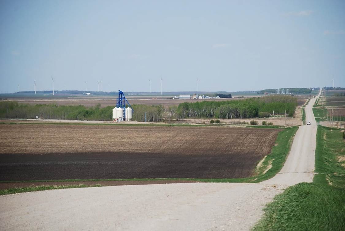 2012/05, BTRC/former CPR mile 103, Binney Corner’s. View looking N. along municipal road No. ____ . This is the N.W. terminus of the Boundary Trail Railway Company’s line. Track crosses road at location of the vehicle on the road. Photo – N.F. (Click on photo for enlargement) © Text and Photos exclusive copyright of N. Froese,