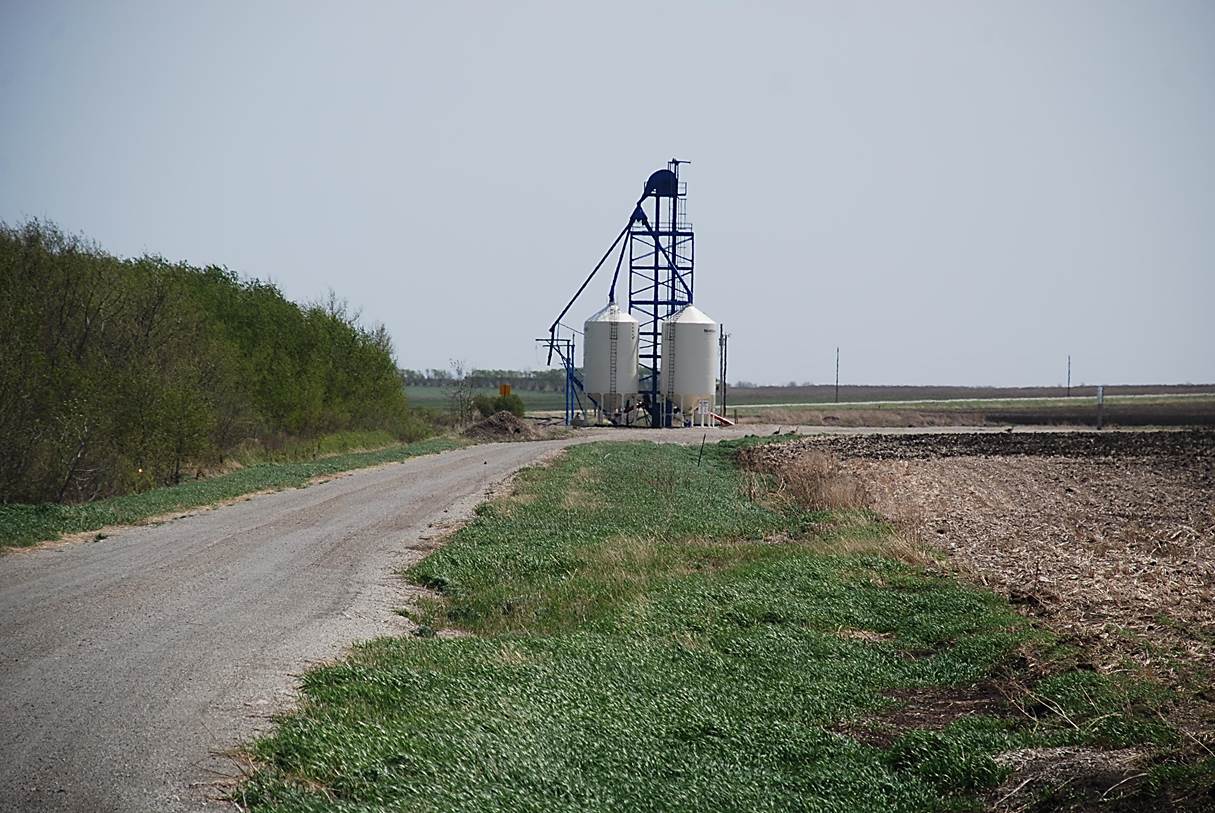 2012/05, BTRC/former CPR mile 103, Binney Corners Yard. View – looking S.E. with rail line ending to the left of terminal. Road in foreground is the former CPR rail bed going N.W. towards La Riviere. Photo – N.F. (Click on photo for enlargement) © Text and Photos exclusive copyright of N. Froese,