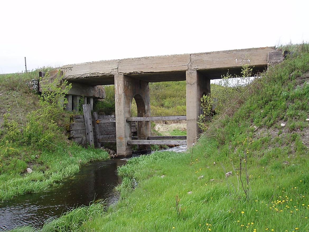 2011/05 BTRC (former CPR) mile 105.1, East side of older reinforced concrete bridge built in 1919 as indicated by stamp on the left end of platform. Each span is 15’ long for a total bridge length of 45’. Wooden bracing between bridge bents are to prevent cattle from crossing into another owner’s pasture. Looking S.W. Photo – N.F. (Click on photo for enlargement) © Text and Photos exclusive copyright of N. Froese,