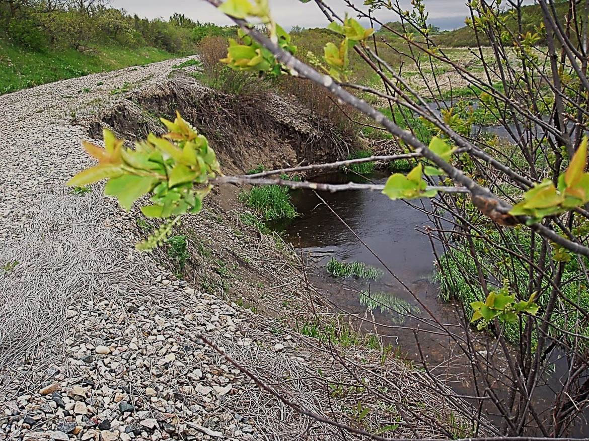 2011/05 Approximately three years after track salvage, the same location, looking S.E. BTRC/CPR mile 105 erosion on S. side of rail bed caused by creek diversion due to a beaver dam which was left intact. Taken with a Nikon 18-135 mm zoom lens. (Click on photo for enlargement) © Text and Photos exclusive copyright of N. Froese,
