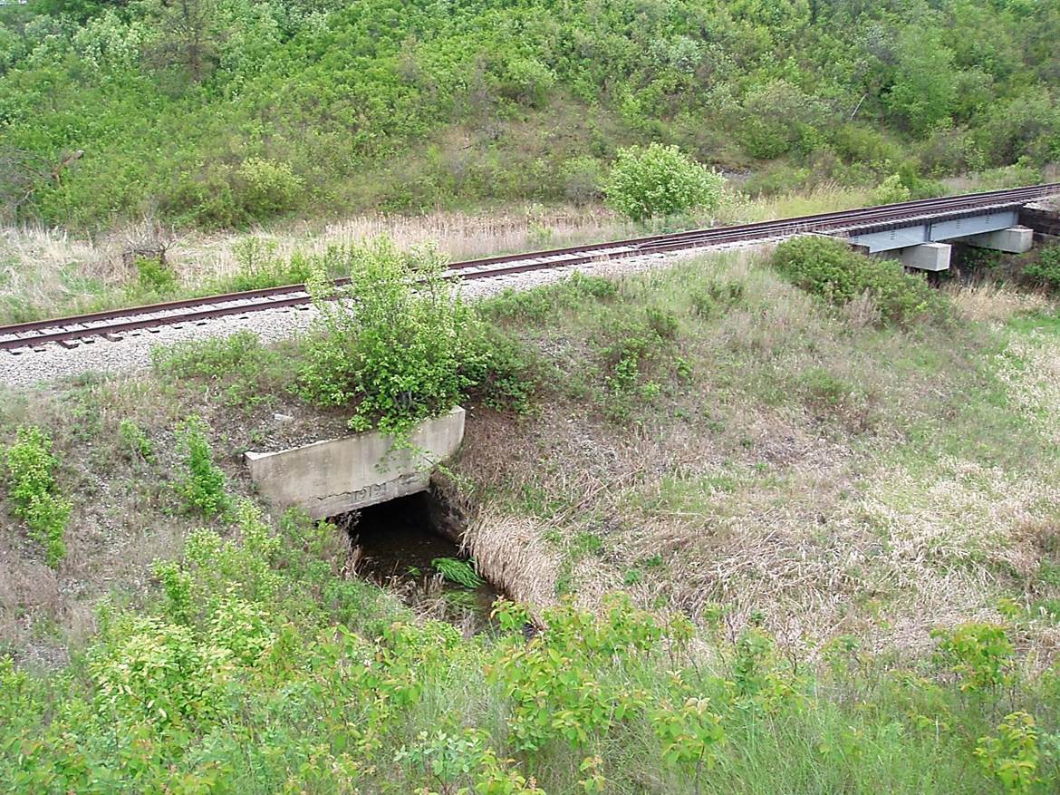 2007/06, CPR mile 105.6, On N. side of track looking S. Concrete bridge and 2 bent trestle on rail bed descending into Pembina River Valley. Taken with a Nikon 18-135 mm zoom lens. (Click on photo for enlargement) © Text and Photos exclusive copyright of N. Froese,