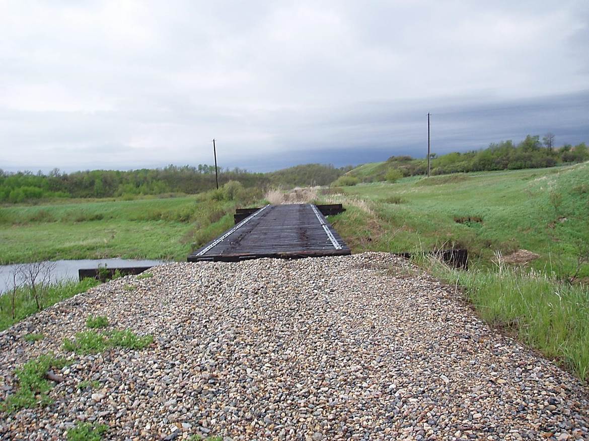 2011/05, almost 4 years later, BTRC/former CPR mile 106.4, abandoned trestle over Mary Jane Creek looking S.W. before crossing municipal road No. 52W. Photo – N.F. Taken with a Nikon 18-135 mm zoom lens. (Click on photo for enlargement) © Text and Photos exclusive copyright of N. Froese,