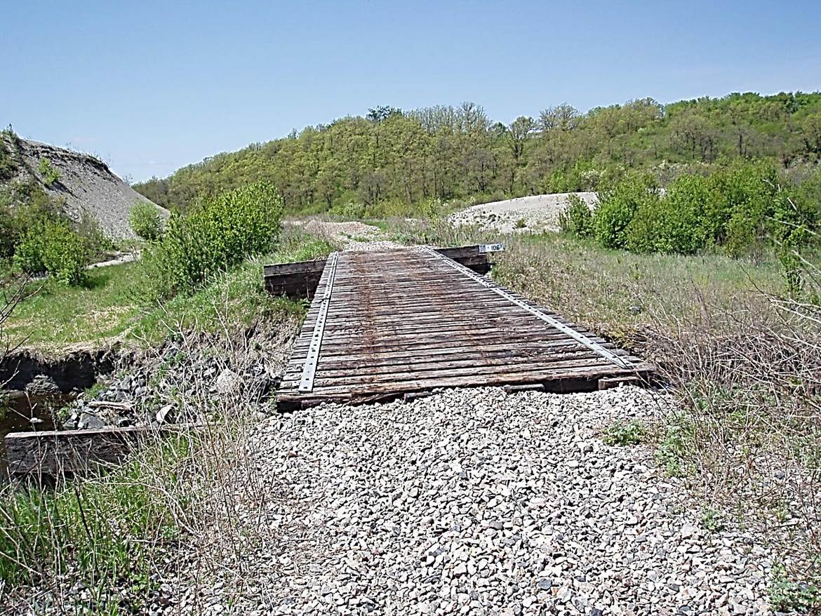 2011/05, CPR trestle at Mile 106.7 – looking west along abandoned rail bed. This is a three – 22’ steel span trestle for a total length of 66’. It was built in 1984. Information – BTRC/CPR files. (Click on photo for enlargement) © Text and Photos exclusive copyright of N. Froese,