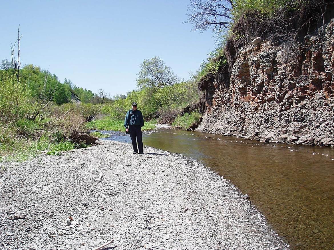 2011/05, BTRC/former CPR mile 107 down below rail bed at end of ATV trail. R. Froese beside a tranquil section of Mary Jane Creek. The creek is quiet here but over the years, has been the nemesis of the CPR due to washouts, flooding and much expense in track and bridge maintenance. Rail bed above +- 100m to photographer’s left. (Click on photo for enlargement) © Text and Photos exclusive copyright of N. Froese,