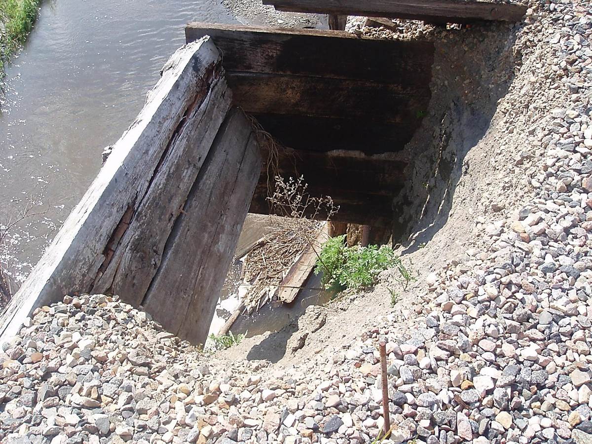 270 The Napinka Subdivision, Mile 0 to Mile 49. Leave a reply 2011/05, CPR mile 3.3 trestle. Close up view of bank erosion at S.E. end. (Click on photo for detail) © Text and Photos exclusive copyright of N. Froese.