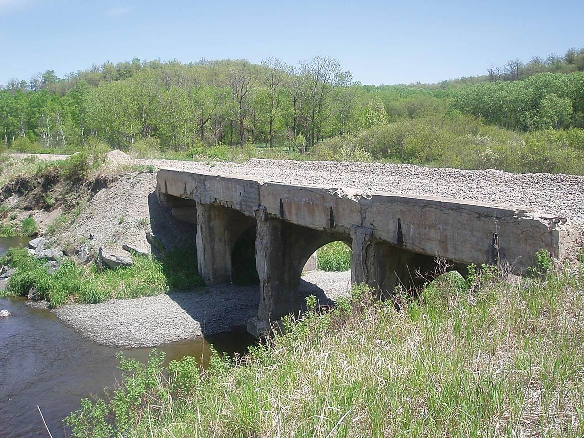 2011/05, BTRC/former CPR mile 108.7, same concrete bridge from the N.- upstream side. Note concrete erosion on lower bridge support. (Click on photo for enlargement) © Text and Photos exclusive copyright of N. Froese,