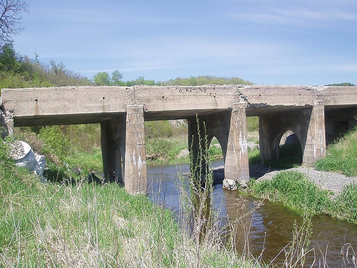 2011/05, BTRC/former CPR mile 108.7, S. side. This bridge, as the next identical bridge at mile 108.8, is a four – 14’ span reinforced concrete bridge built by C. Watling in 1917. Total bridge length is 56’. Note white bags of gravel fill to prevent erosion under end of bridge (left). (Click on photo for enlargement) © Text and Photos exclusive copyright of N. Froese,