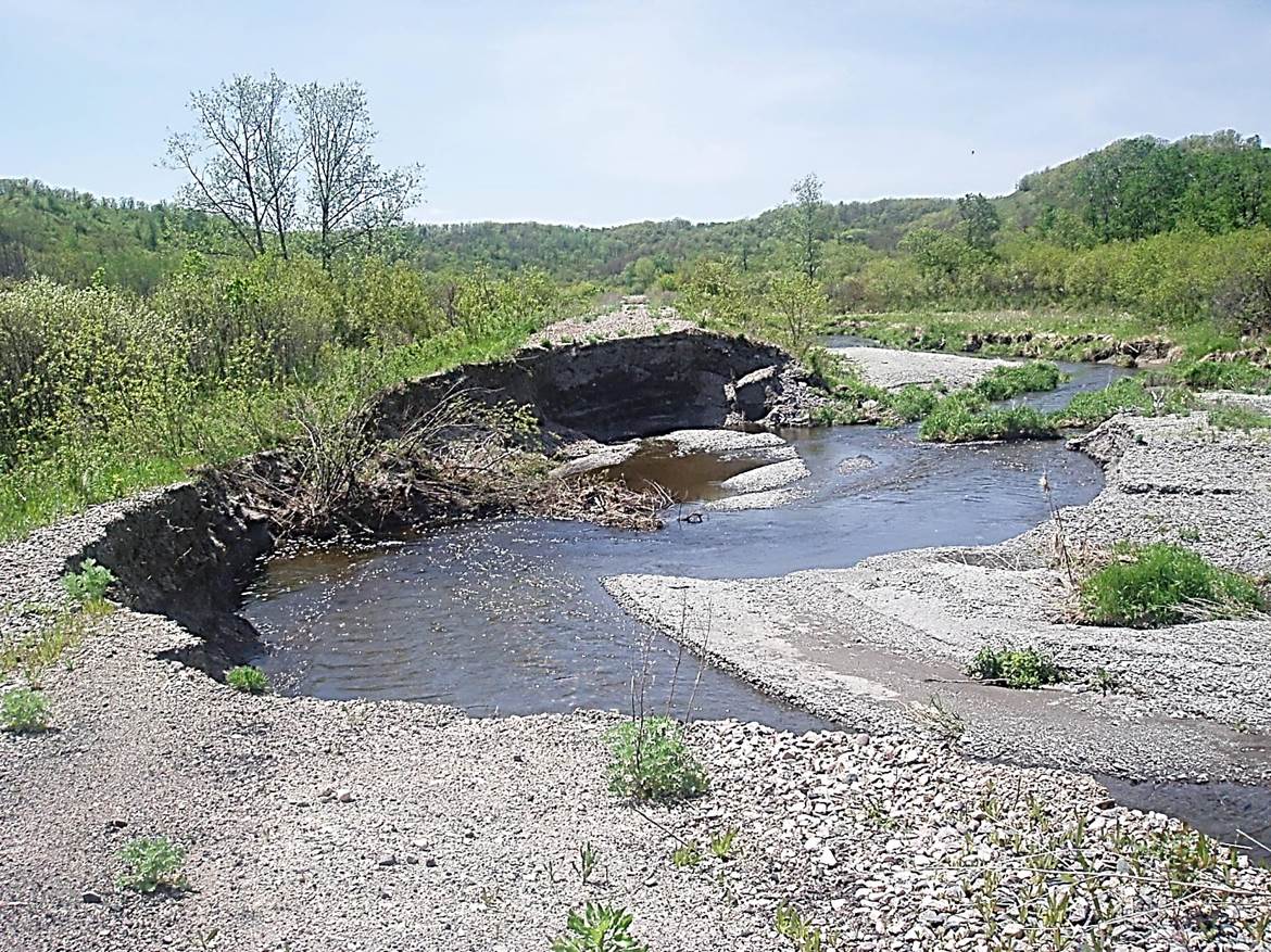 2011/05, Four years later – After Track Removal. Looking S.W. along rail bed, BTRC/former CPR mile 108 near S.W. end. Largest washout. Location – just N.E. of mile 109. Oh, Mary Jane! (Click on photo for enlargement) © Text and Photos exclusive copyright of N. Froese