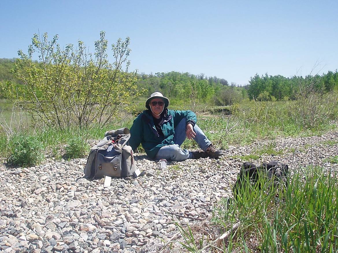 2011/05, BTRC/former CPR La Riviere sub. Mile 109.5 at S.W. end of trestle. View to the S.W. Snack break time – N. Froese. Photo – R.F. (Click on Photo for enlargement) © Text and Photos exclusive copyright of N. Froese,