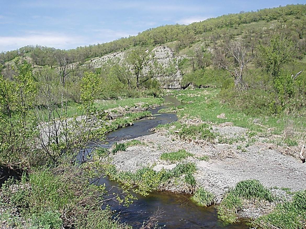 2011/05, BTRC/former CPR mile 110 looking N.E. from track bed. Pretty Mary Jane Creek wending its way down to the Pembina River. (Click on photo for enlargement) © Text and Photos exclusive copyright of N. Froese.