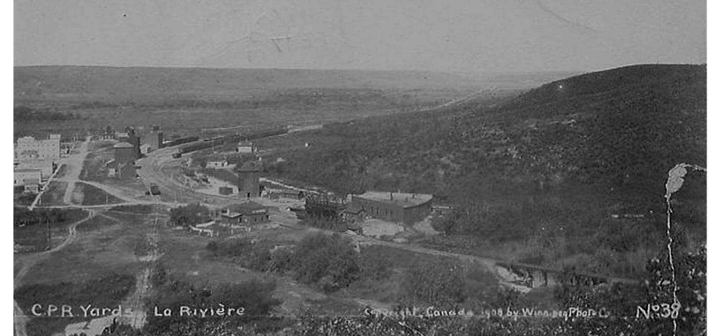 About 1908, CPR La Riviere Sub. mile 111; CPR Napinka Sub. mile 0, division point. View – looking E.to W. Notice track as well as road to brickyard in left foreground. Trestle across Mary-Jane Creek in right foreground. Centre – l.to r. station, coal dock, machine shop/4 stall engine house with turntable in front (located behind coal dock), water tower, right of water tower is locomotive foreman office supply, 3 grain elevators on curved yard track. Above water tower –left, west section house; directly above water tower is locomotive foreman’s house/engineman’s bunk house. (Click on photo for enlargement) Photo credit: Copyright Winnipeg Photo, – collection of B. Schuff