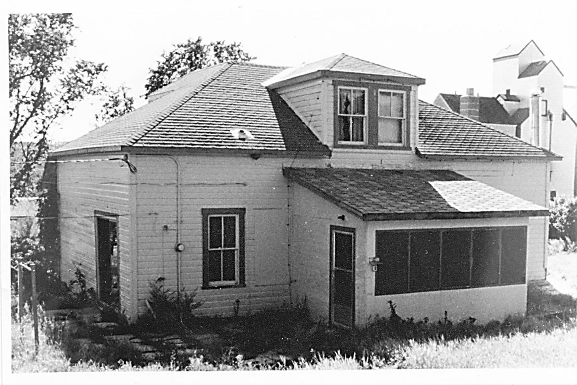 1950’s, CPR mile 111, La Riviere, N. exposure of Locomotive Foreman’s house and Engineer’s bunkhouse on N. side of rail yard. Manitoba Pool Elevator in right background. Photo – collection of B. Schuff