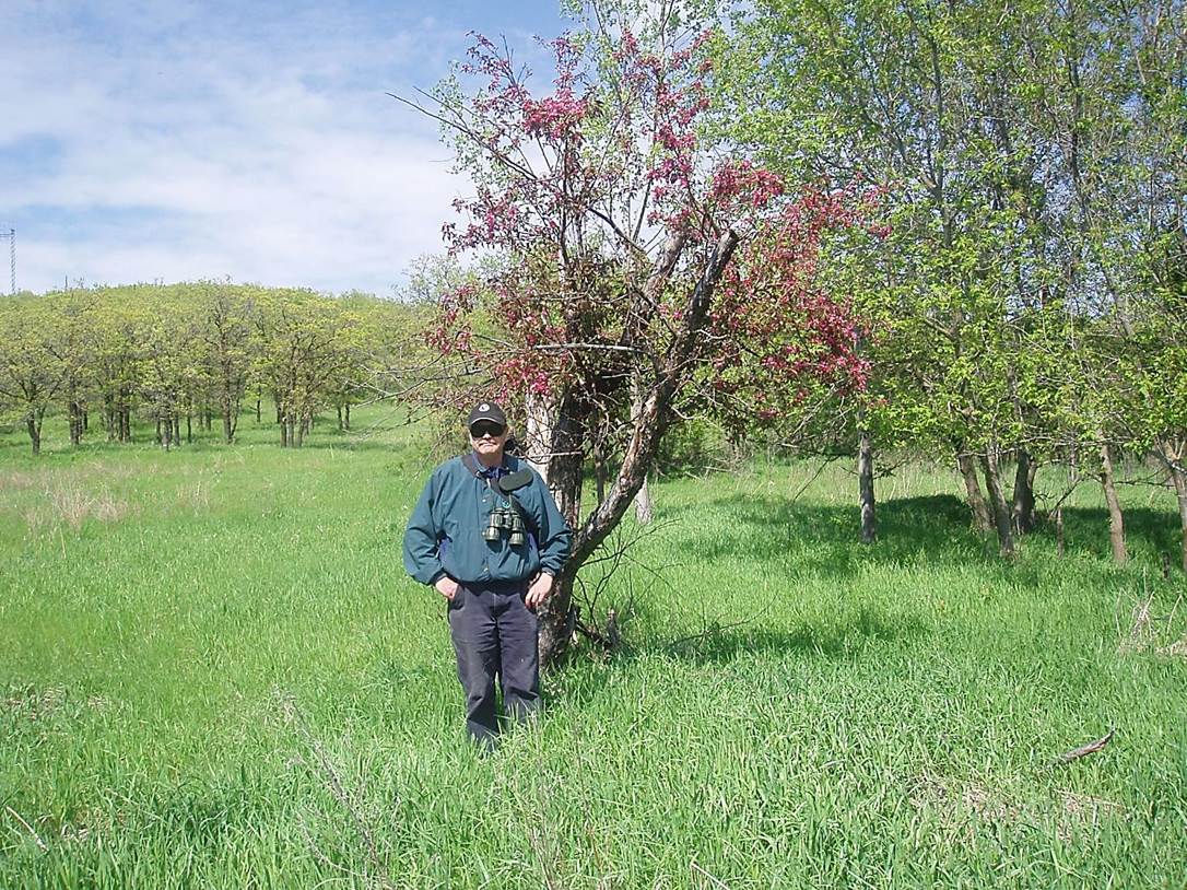 2011/05 CPR mile 111, backyard of Locomotive Foreman’s/Engineer’s bunkhouse. What is left – a weathered flowering crab of years gone by. Raymond Froese, brother in photo. View – looking N. from the bunkhouse. (Click on photo for detail) © Text and Photos exclusive copyright of N. Froese.