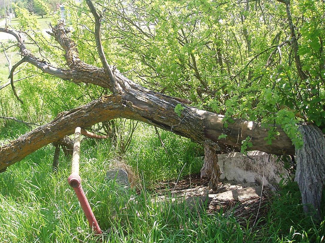 2011/05, CPR mile 111. Remnants of a once busy concrete step and handrail leading down to the former rail yard on the S. side of the Engineer’s/Locomotive Foreman’s bunkhouse. The steps and handrail (see post number 234), are now dominated by a fallen dead elm, – somewhat symbolic of the abandonment that has happened to prairie rail branch lines in Canada during the 1990’s and early 2000’s. (Click on photo for detail) © Text and Photos exclusive copyright of N. Froese.