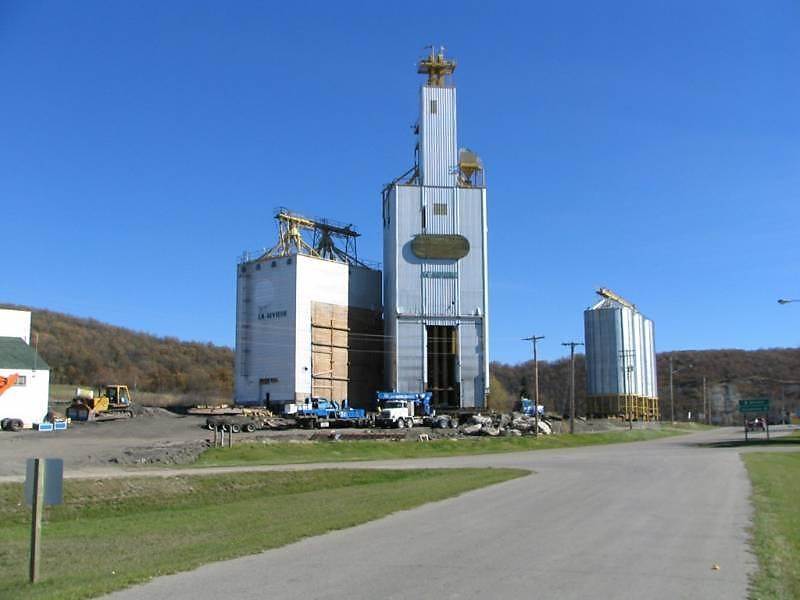 2004/10 -11, CPR mile 111, La Riviere yard. The end of an era for La Riviere. Moving the former Agricore elevator to Somerset, MB. (Click on photo for detail) Photo credit – Ken Jacobs