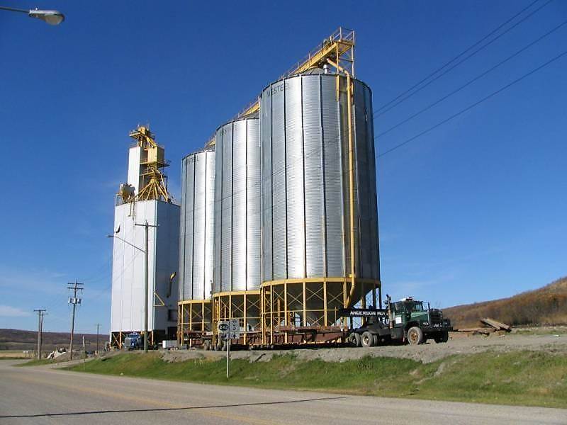 2004/09 – 11, CPR mile 111, La Riviere yard. The end of an era for La Riviere. Moving the former Agricore elevator hopper bottom bins to Somerset. (Click on photo for detail) Photo credit – Ken Jacobs, Photo Sharing Gallery by PhotoPost