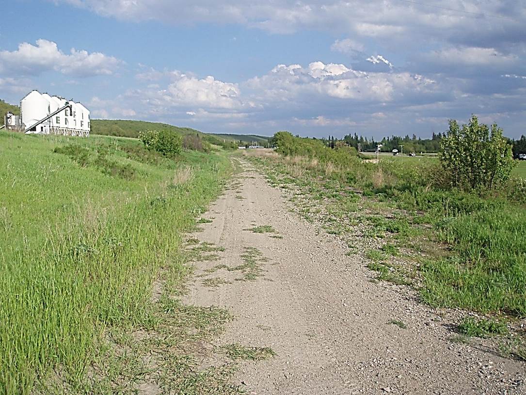 2011/05, Five years hence from previous photo, – After track salvage – CPR Napinka sub. Mile 1, W. end of La Riviere yard – looking E. Elevator is gone. Remaining Vitiera Company bins on the left. (Click on photo for detail) © Text and Photos exclusive copyright of N. Froese.