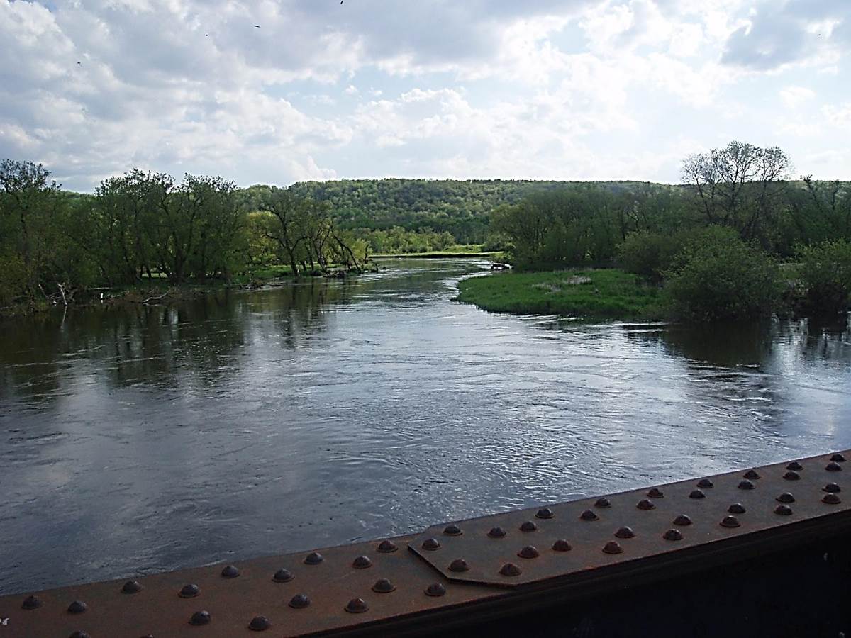 2011/05, CPR Napinka Sub. Mile 1.5. View south off of the HDPG bridge at the Pembina River at high water level – flood stage. (Click on photo for detail) © Text and Photos exclusive copyright of N. Froese.