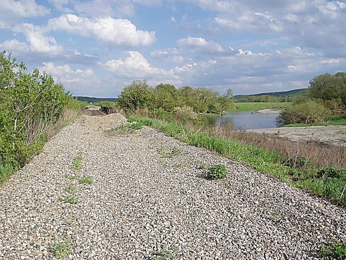 2011/05, CPR mile 1.5, after track salvage – looking E. across Pembina River at high water level towards La Riviere. (Click on photo for detail) © Text and Photos exclusive copyright of N. Froese.