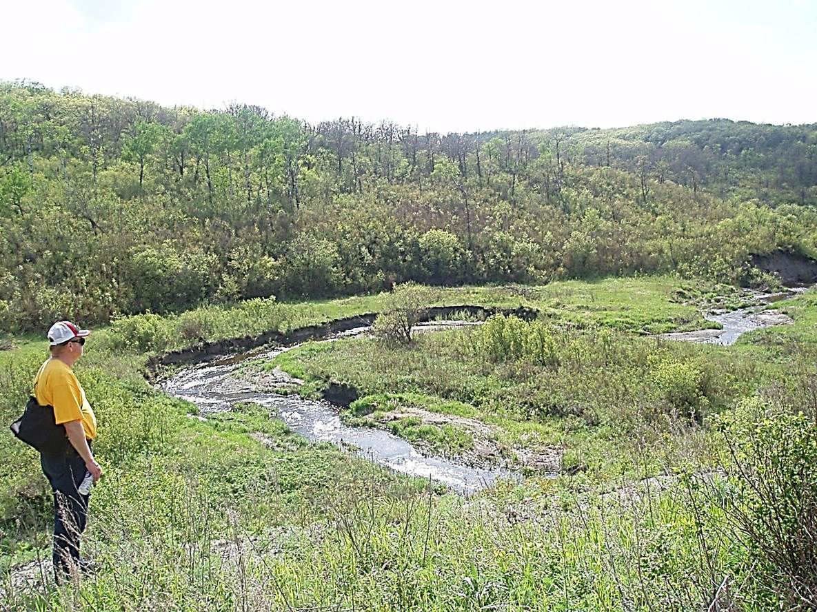 2011/05, CPR Napinka Sub. Mile 4. R. Froese observing scenic view of McCoy’s Creek looking south from rail bed into gorge. (Click on photo for detail) © Text and Photos exclusive copyright of N. Froese.
