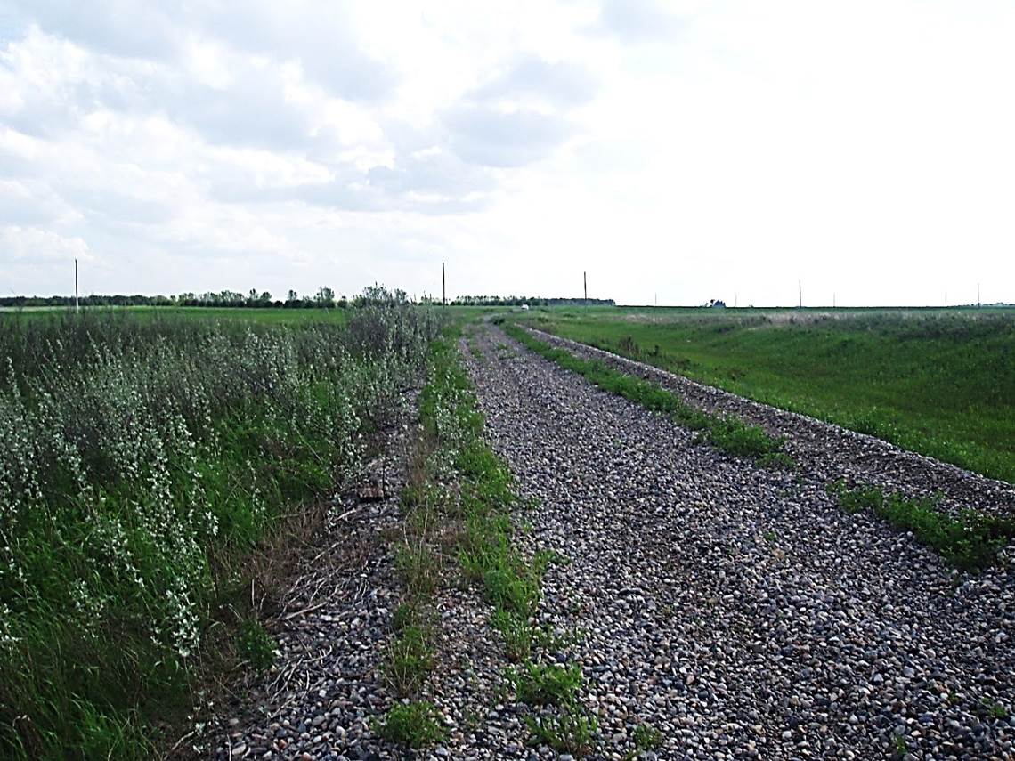 2011/05, CPR/ Napinka Sub. Mile 5 heading S.W. Notice the prairie plant species, – Wolf Willow growing on left side of rail bed. (Click on photo for detail) © Text and Photos exclusive copyright of N. Froese.