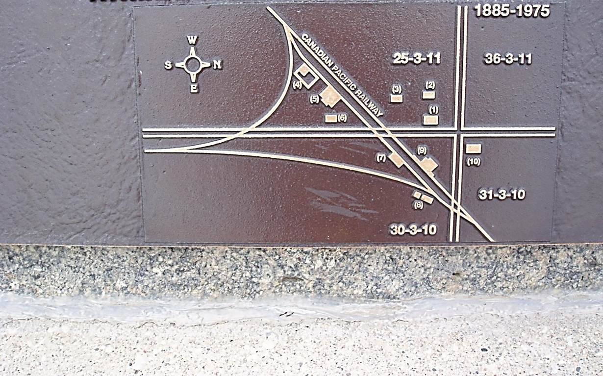 2011/05, CPR/ Napinka Sub. Mile 7. This plaque clearly shows the layout of the hamlet of Woodbay during its heyday. 1) Store/Post Office, 2) Stable, 3) Pool Elevator House, 4) Stockyard, 5) Pool Elevator, 6) Weigh Scales, 7) Loading Platform, 8) Tool Shed/Bunkhouse, 9) CPR Station,