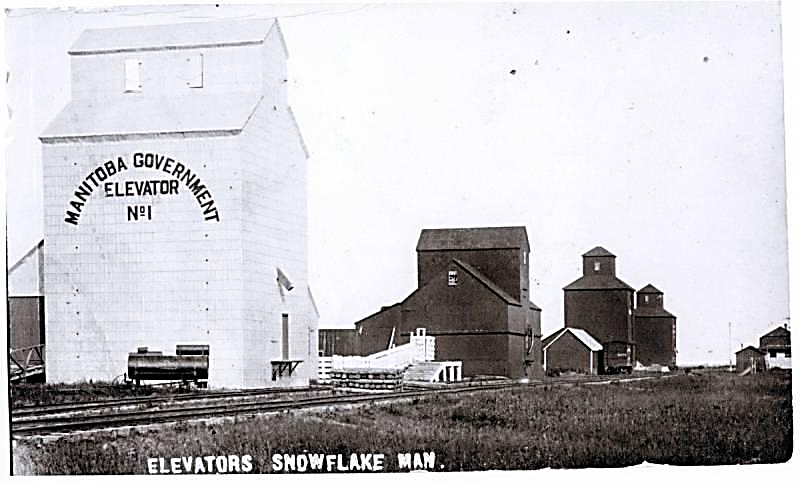 c. 1910, CPR Napinka Sub., Mile 23.7, Elevators and Canadian Pacific Railway depot Snowflake Manitoba. Bernard Kelker (Information – Photo Sharing Gallery by PhotoPost and Wilson, D. (2012). From Abbey to Zorra via Bagdad.