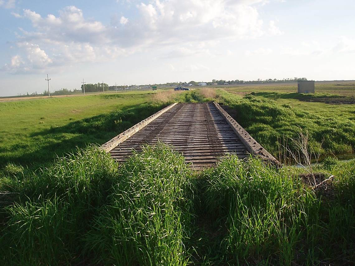 2011/05, CPR/ Napinka Sub. Mile 11.4. This trestle was built in 1965 and has five – 15’ timber spans for a total length of 75’. View – looking S.W. Pilot Mound in the distance. (Information – BTRC/CPR files.) (Click on photo for detail) © Text and Photos exclusive copyright of N. Froese.