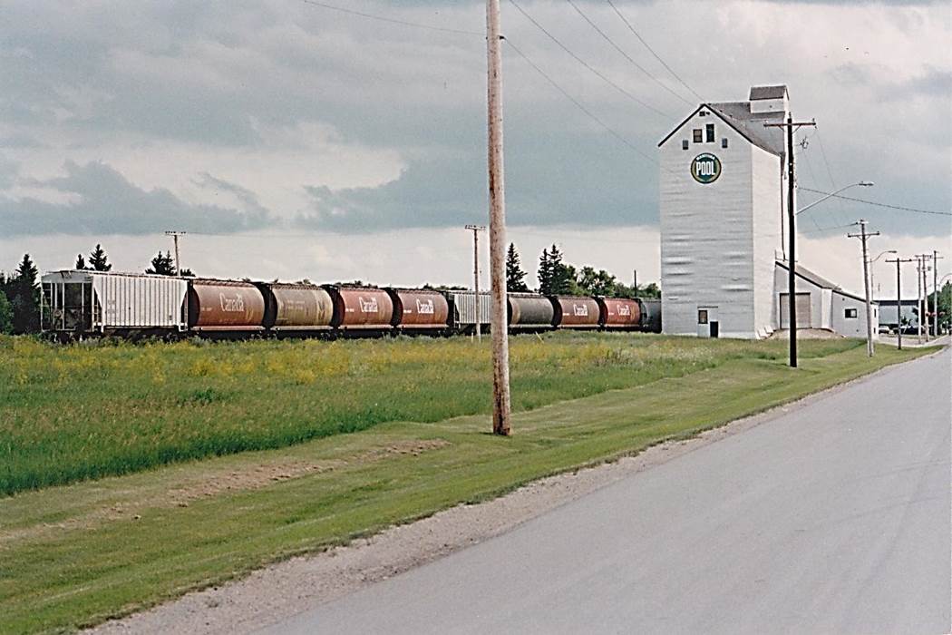 1997/07, CPR/ Napinka Sub. Mile 12. Pilot Mound in a better day – view looking S.W. Manitoba Pool Elevator in its later years. (Click on photo for detail) © Text and Photos exclusive copyright of N. Froese.