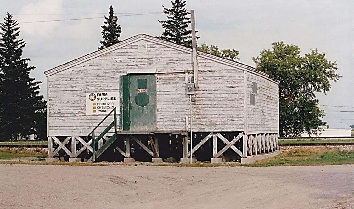 1997/07, CPR/ Napinka Sub. Mile 12, Pilot Mound. Manitoba Pool storage shed for farm supplies (fertilizer, chemicals, twine). View looking S.E. across siding track and main track. (Click on photo for detail) © Text and Photos exclusive copyright of N. Froese.