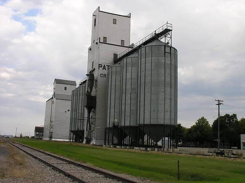 “Crystal City, MB -2006-08-17-007”, CPR /Napinka Sub. mile 17. View – looking E. from rail yard. Left to right – (former Pool and Paterson Grain elevators. The Pool elevator was purchased by Paterson) Photo Credit – Wes Cromwell, Photo Sharing Gallery by PhotoPost. (Click on photo for alternate view)