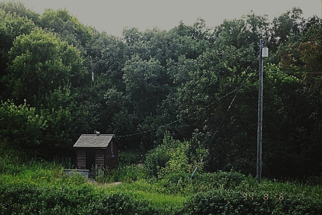 1994/08, CPR/Napinka Sub. Mile 21.1 The Clearwater Pump House. This pump house, now electrical powered, is used to pump water up to the Clearwater Water Tower about 400m to the W. The tower is now the village water source. At one time this pump house was a larger building housing a stationary steam engine and a coal bin. Coal was slid down a chute on the side of the rail bed from a train car parked on the track high above to the left in this photo. (Information – “Prairie Pride Land-Looking Back” The Louise History Book Committee, 1998) (Click on photo for detail) © Text and Photos exclusive copyright of N. Froese.