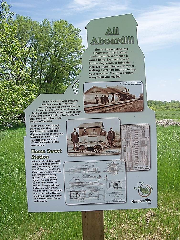 2011/05, CPR /Napinka Sub. Mile 21, Clearwater yard, site of station. The sign describes a brief history of the impact of train travel starting in 1885. Also included is an unusual architectural drawing of a No. 2 station. This indicates a difference from the usual ‘type 2 station ‘ as indicated in the book, “Canadian Pacific’s Western Depots” by (Bohi and Kozma, 1993). Also, the station in the photo on the sign is a typical “type 2”, whereas the blueprint on the sign has some discrepancies with the photograph. (Information source, CPR Archives) (Click on photo for detail) © Text and Photos exclusive copyright of N. Froese.
