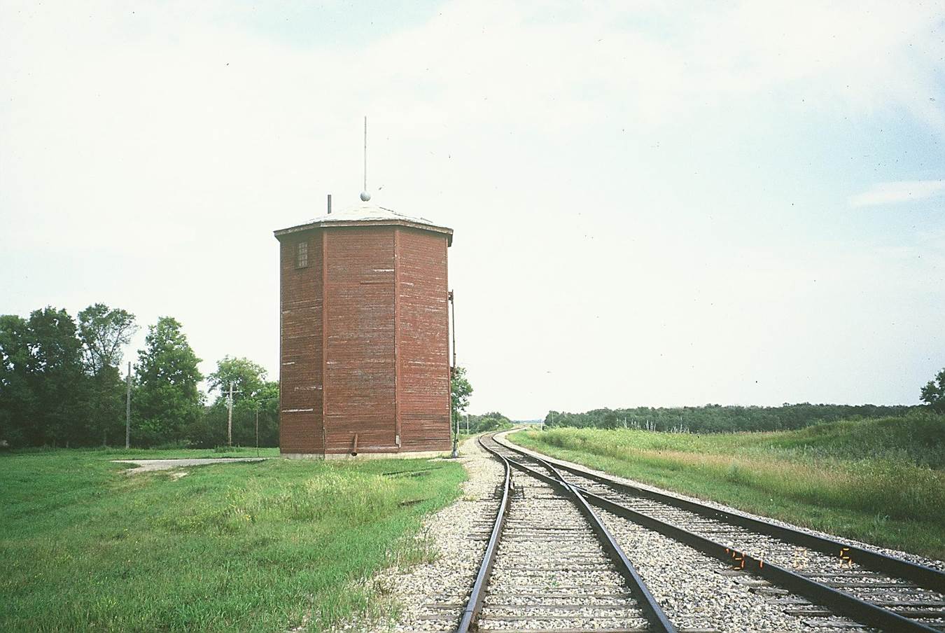 1994/08, CPR/Napinka Sub. Mile 21. The water tower at Clearwater, MB, which is used for the village water supply. According to this photo the station would have been on the main track behind the water tower. The switch points start adjacent to the water tower instead of further east as in previous photo. View – looking E. towards the bridge across Long River. Photo taken with a Minolta 70 – 210 mm telephoto zoom lens. (Click on photo for detail) © Text and Photos exclusive copyright of N. Froese, Author.