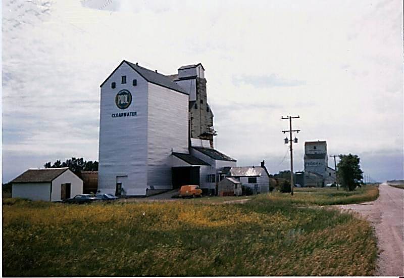 “Taken in the mid. 80’s” CPR/Napinka Sub. mile 21. The two Clearwater elevators., Manitoba Pool and Federal. New siding is being installed on the Pool elevator. View – looking W. Photo Credit – quest – from the collection of Photo Sharing Gallery by PhotoPost.