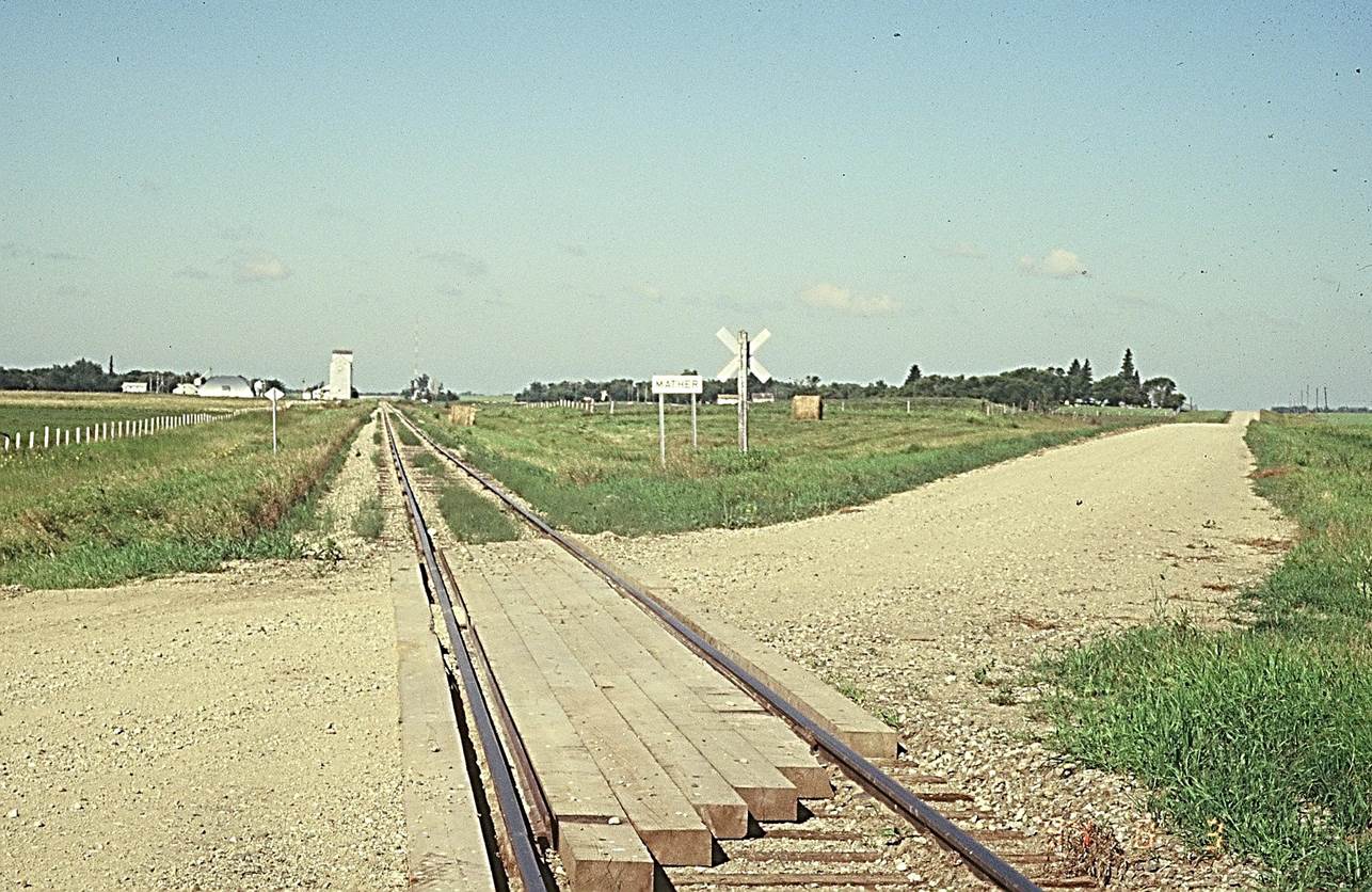 1994/08 CPR/Napinka Sub. Mile 27. View – looking S.W. to Mather, MB. Mather Pool elevator and skating rink in the distance on left side of track. (Click on photo for detail) © Text and Photos exclusive copyright of N. Froese,