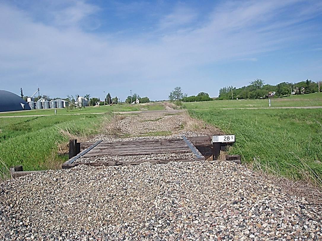 2011/05, CPR/Napinka Sub. Mile 28.5 bridge just E. of Mather. This is a 16’ timber span bridge built in 1969. View – looking S.W. with former section house left of rail bed in the distance. (Information –BTRC/CPR files) (Click on photo for detail) © Text and Photos exclusive copyright of N. Froese,