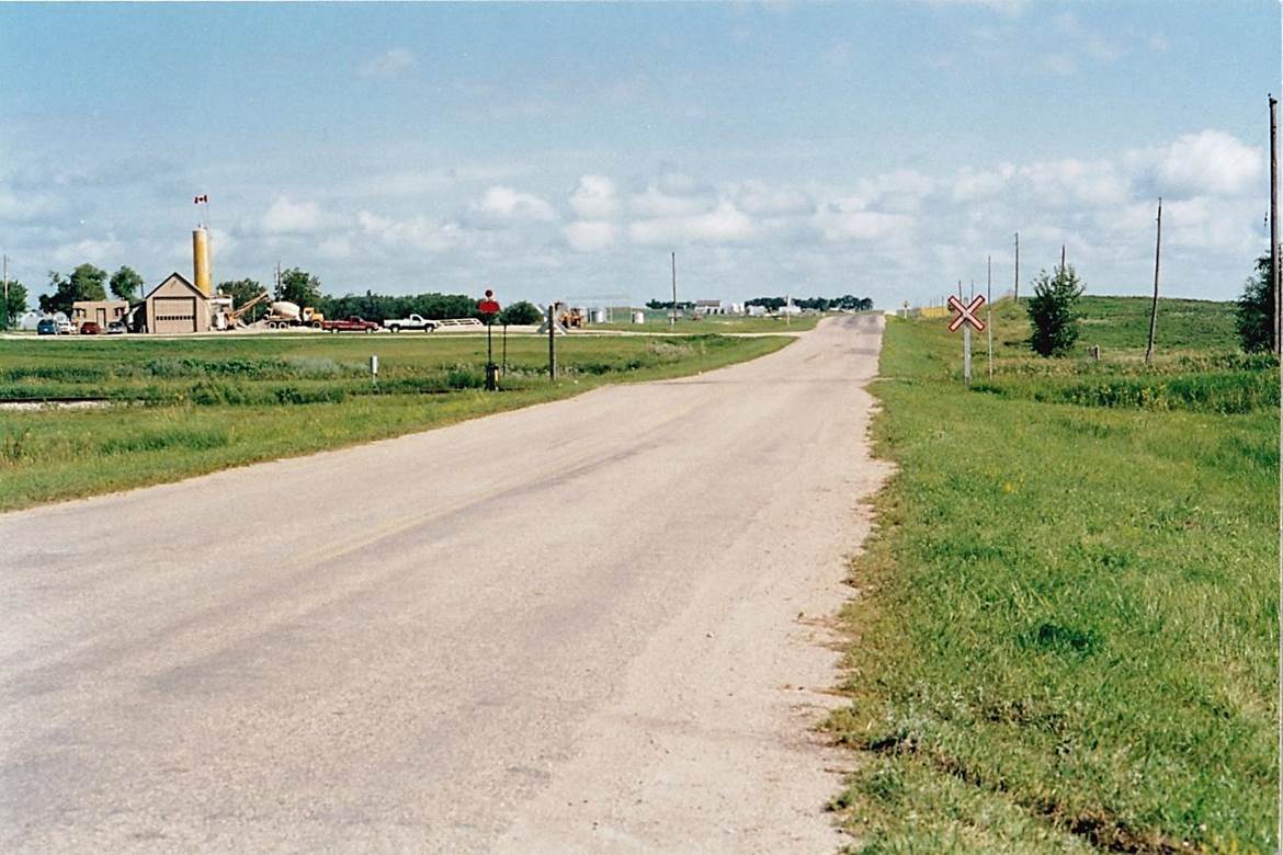1997/07, CPR/Napinka Sub. Mile 28. View – looking north at track crossing provincial road No. 442. Note switch stand for turnout to the grain elevator siding on S. side of main track and W. side of road. (Click on photo for detail) © Text and Photos exclusive copyright of N. Froese,