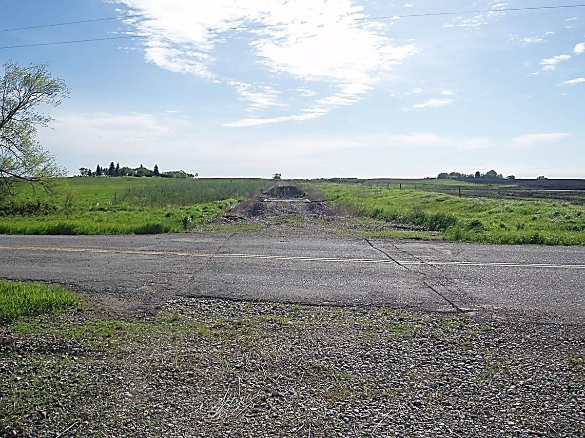 2011/05, CPR/Napinka Sub. Mile 28. View looking back N.E. from Mather yard across provincial road No. 442. A view of the bridge at mile 28.5 with a pile of gravel on the far side to discourage motor vehicle traffic. Mather cemetery in the distance on the left. (Click on photo for detail) © Text and Photos exclusive copyright of N. Froese.