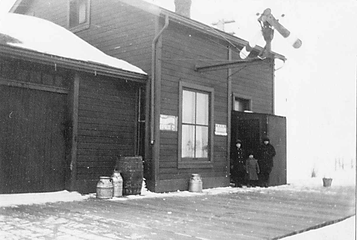 1920’s, CPR mile 28, Mather station in the winter. View – looking N.E. from main track onto station platform. Signs on station adjacent to window are – “Dominion Express Co.” and “CPR Telegraph”. Boys in the picture – l to r: Chisholm Davis, Ralph Davis, Harry Davis. Photo credit – from the collection of Chisholm Davis.
