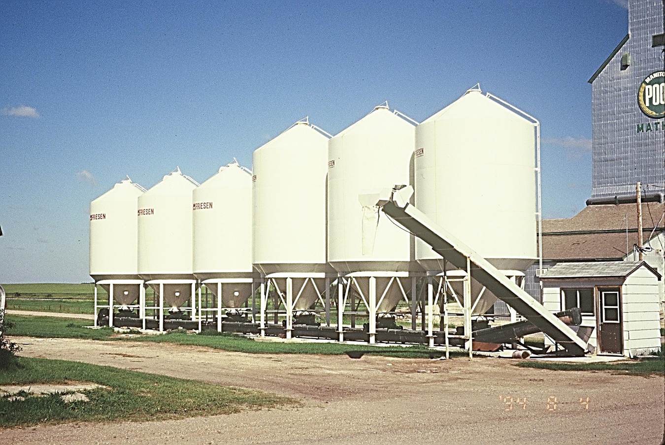 1994/08, CPR/Napinka Sub. Mile 28. Close up of Mather. Manitoba Pool Elevator and “Harms Seeds” bins. View – looking N.W. from Vaughn Street. Railway visible on extreme left of bin row past gravel road. (Click on photo for detail) © Text and Photos exclusive copyright of N. Froese.