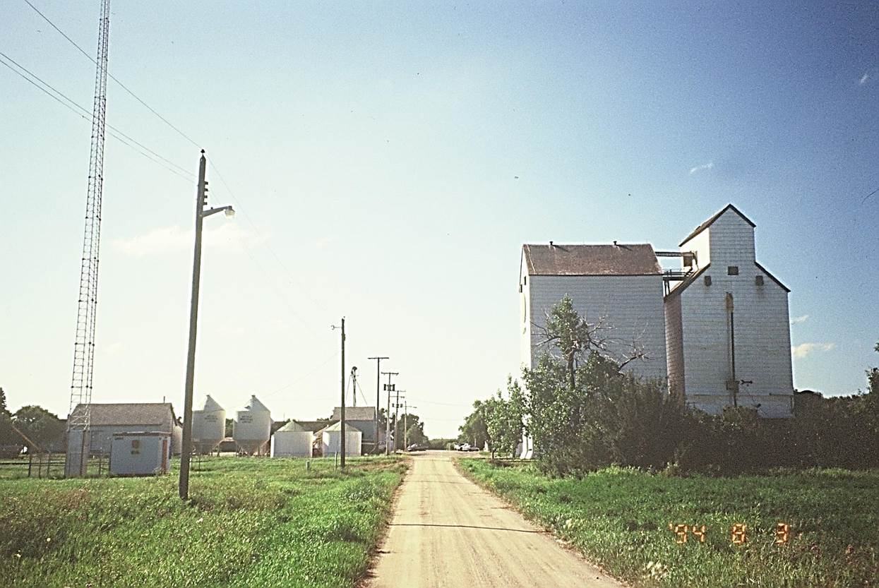 1994/08, CPR/Napinka Sub. Mile 28. Mather, view – looking S. on Vaughn Street across the tracks. In photo (from l. to r.), CP communications tower, MB Pool hopper bottom bins, two MB Pool wooden storage bins, Harms Seeds Plant with grain leg on E. side of street, Manitoba Pool Elevator from the north with two tracks running on near side. (Click on photo for detail) © Text and Photos exclusive copyright of N. Froese.